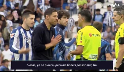 比赛第32分钟,皇家社会反击机会,赫伊森犯规,主裁判曼萨诺果断出示红牌。转播方拍到了皇马主帅阿隆索与裁判曼萨诺沟通的内容。