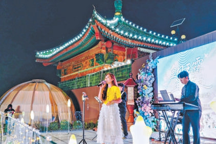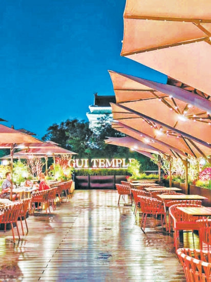 再向南走,沐浴着落日余晖,天坛公园东门旁,红桥市场屋顶露台迎来一天中最热闹的时刻。这一传统消费地标因“观坛”的绝佳位置成了新晋“祈年殿日落打卡点”。露台之上,七个半球形玻璃屋与天坛的七星石相映成趣。夜幕低垂,祈年殿灯光亮起,品尝着祈年殿造型的茶点,听着现场演奏的蓝调音乐,游客不禁感慨:“全感官品味天坛,太特别了!”