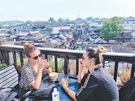 两名游客在庆云楼露台上享受休闲时光。曹胜摄