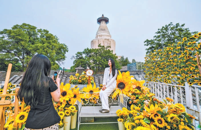 游客在白塔寺旁一家咖啡店露台上拍照。本报记者武亦彬摄