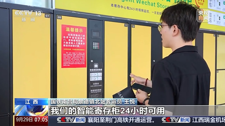 国铁南昌局景德镇北站客运员 王悦:很多游客来景德镇想先去景区逛一逛,但拖着行李箱很不方便。我们的智能寄存柜24小时可用,扫码就能操作。