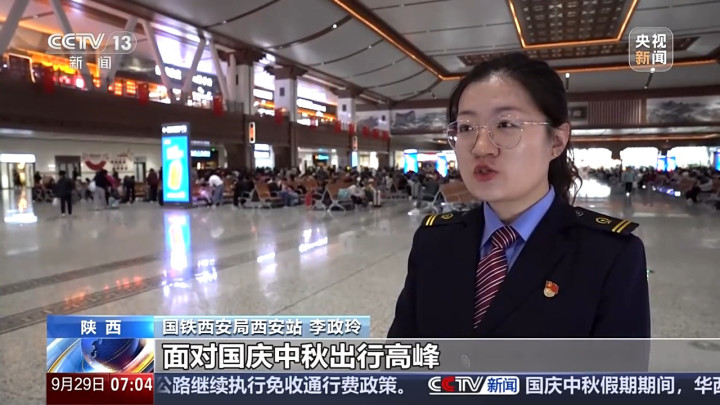 国铁西安局西安站 李政玲:面对国庆中秋出行高峰,西安站预计开行旅客列车5039.5对,日均420对。加开动车组列车516对、普通旅客列车175对。