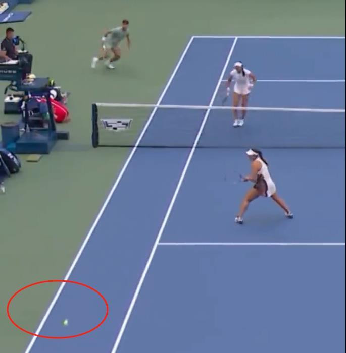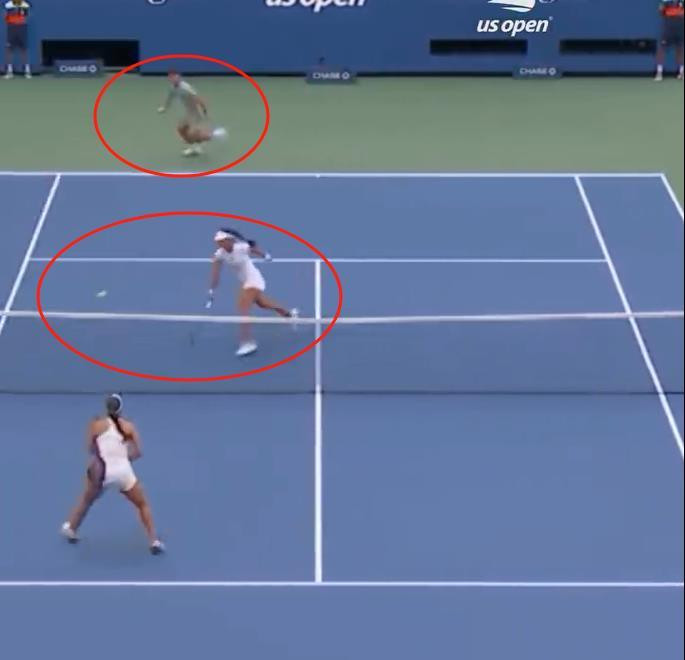 德雷珀与拉杜卡努多拍对拉,双方角度越来越刁钻。德雷珀打出一记大角度斜线,球速很快,拉杜卡努直接扑空,只见球稳稳落在线内,弹跳后飞向边线之外。正在此时,位于拉杜卡努后方的阿尔卡拉斯突然疾速赶到,以一记精妙的outsidein,将这颗球救起,打回到对方界内。
