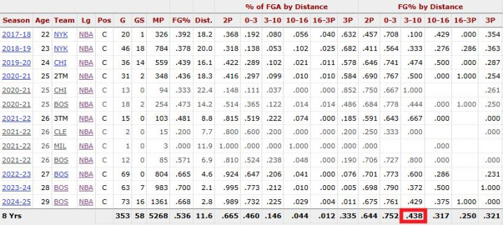 作为一个身高2米18的大汉,从生涯43.8%近篮下投篮率看并非大部分同位置“糙汉”那样,而是具有一定抛投、勾手的终结小技巧。进攻端终结效率相对不俗,这是其一。