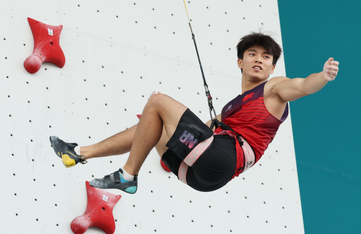 2024年8月8日,中国选手伍鹏在巴黎奥运会攀岩男子速度赛半决赛后庆祝。新华社记者 高静 摄