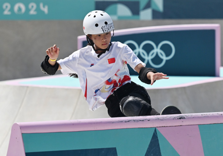 2024年8月6日,中国选手郑好好在巴黎奥运会滑板女子碗池预赛中。新华社记者 程敏 摄