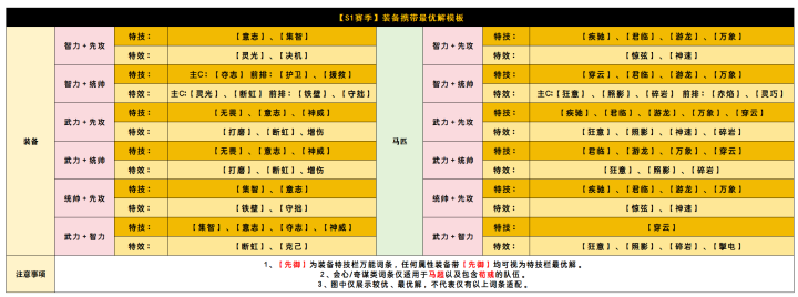 如果我们只有两个或者两个以下的格子,那没得选,分别保留主C与前排装备即可,如果有三个格子,那就要提前想好下赛季用什么阵容开荒,比如用苦肉弓开荒,装备属性就要求是一统先,一智统,一智先,如果是刘备法正马超开荒,装备属性就得是一智统,一武先,一智先,不清楚自己开荒阵容的,可以翻看我S2的攻略,但不管是什么开荒阵容,都至少需要去追求三件【先御】词条的装备,有【先御】没【先御】,开荒完全不是一个难度,这也是整个S1赛季结束时,我们首先要做的事。