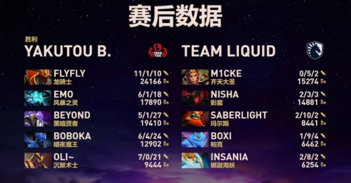 天辉Liquid:SaberLight玛尔斯、Boxi帕克、INSaNia小娜迦、Nisha影魔、mICKe大圣。