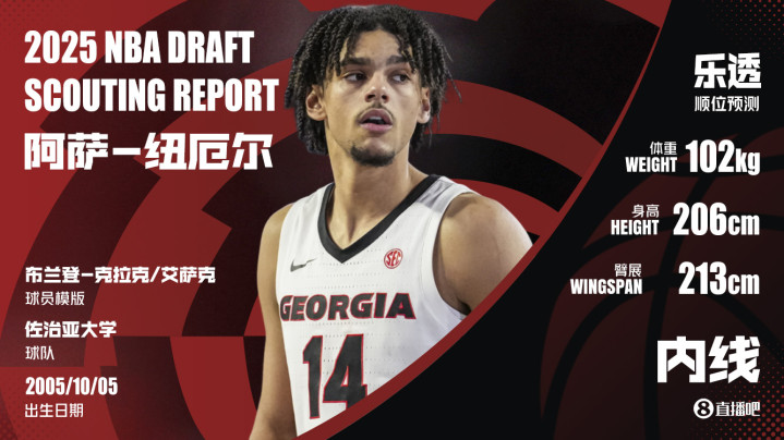 23号签选中纽厄尔。在今年的选秀大会上,老鹰做了一笔交易,将13号签送至鹈鹕,换23号签和2026年无保护首轮。完成交易后,他们在第23顺位选中了阿萨-纽厄尔,这是一个2米06的大前锋,特点是打球很拼,防守出色,但投篮需要提高。上赛季他在佐治亚大学场均15.4分6.9篮板1抢断1盖帽,投篮命中率54.3%,三分命中率29.2%,罚球命中率74.8%。