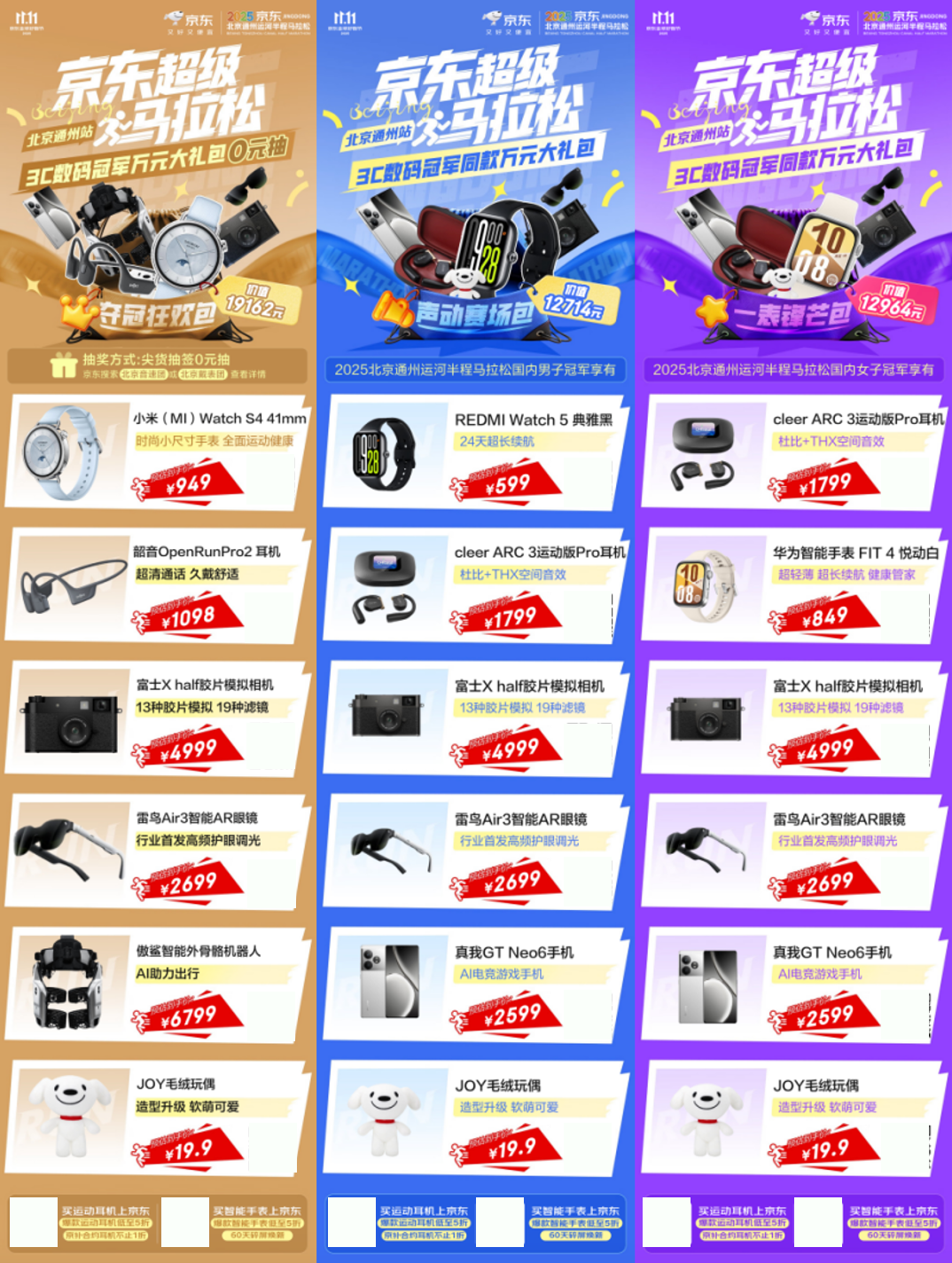 此次“3C数码冠军万元大礼包”共设三款,融合智能设备、运动科技与生活潮品,为跑者提供全方位的装备支持:价值19162元的“夺冠狂欢包”,包含小米Watch S4 41mm智能手表、韶音OpenRunPro2运动耳机、富士X half胶片模拟相机、雷鸟Air3智能AR眼镜、傲鲨智能外骨骼机器人、JOY毛绒玩偶等,全面涵盖健康、影像、出行、娱乐多维场景。即日起登录京东APP搜索“北京音速团”或“北京戴表团”,即可参与“尖货抽签0元抽”活动,赢取同款冠军大礼包。